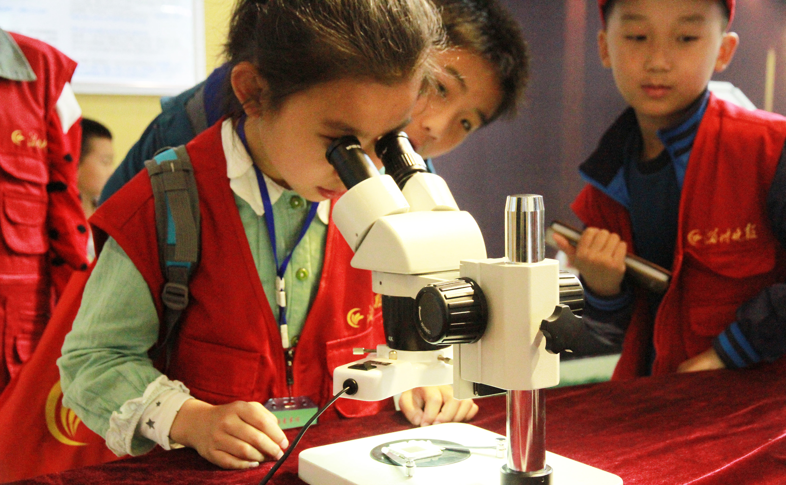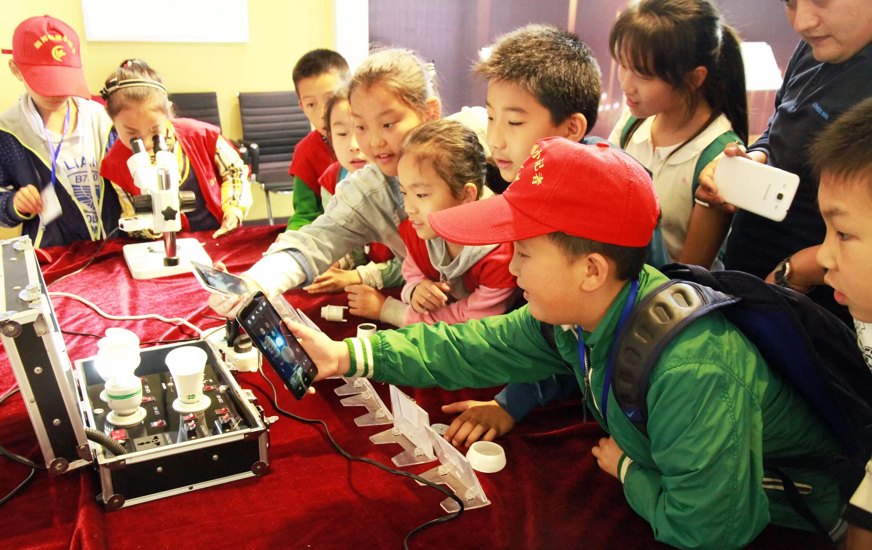 ▲“我是小小科学家。”小记者们显微镜下观看LED芯片的结构,了解嗨泡四季灯的主要元器件,并用手机拍照功能检测LED灯是否频闪。“好灯不频闪!回家我就给爸妈演示下!”