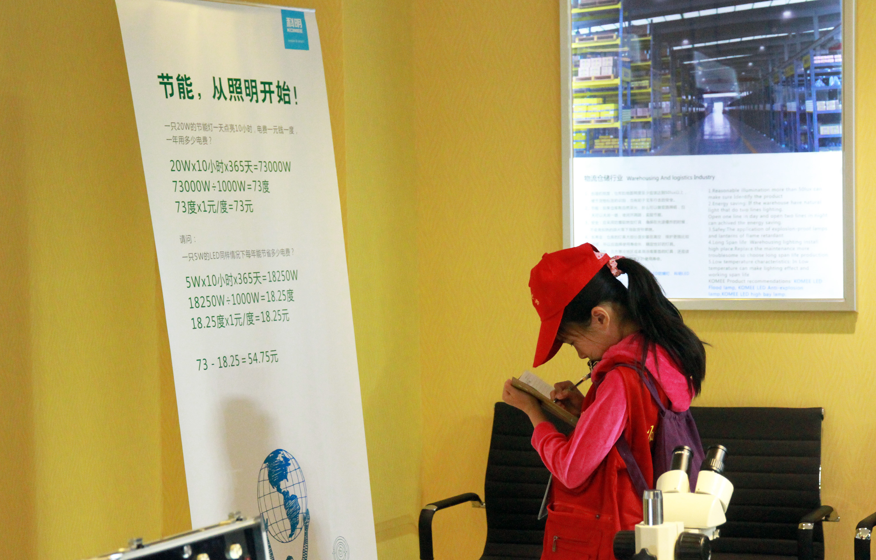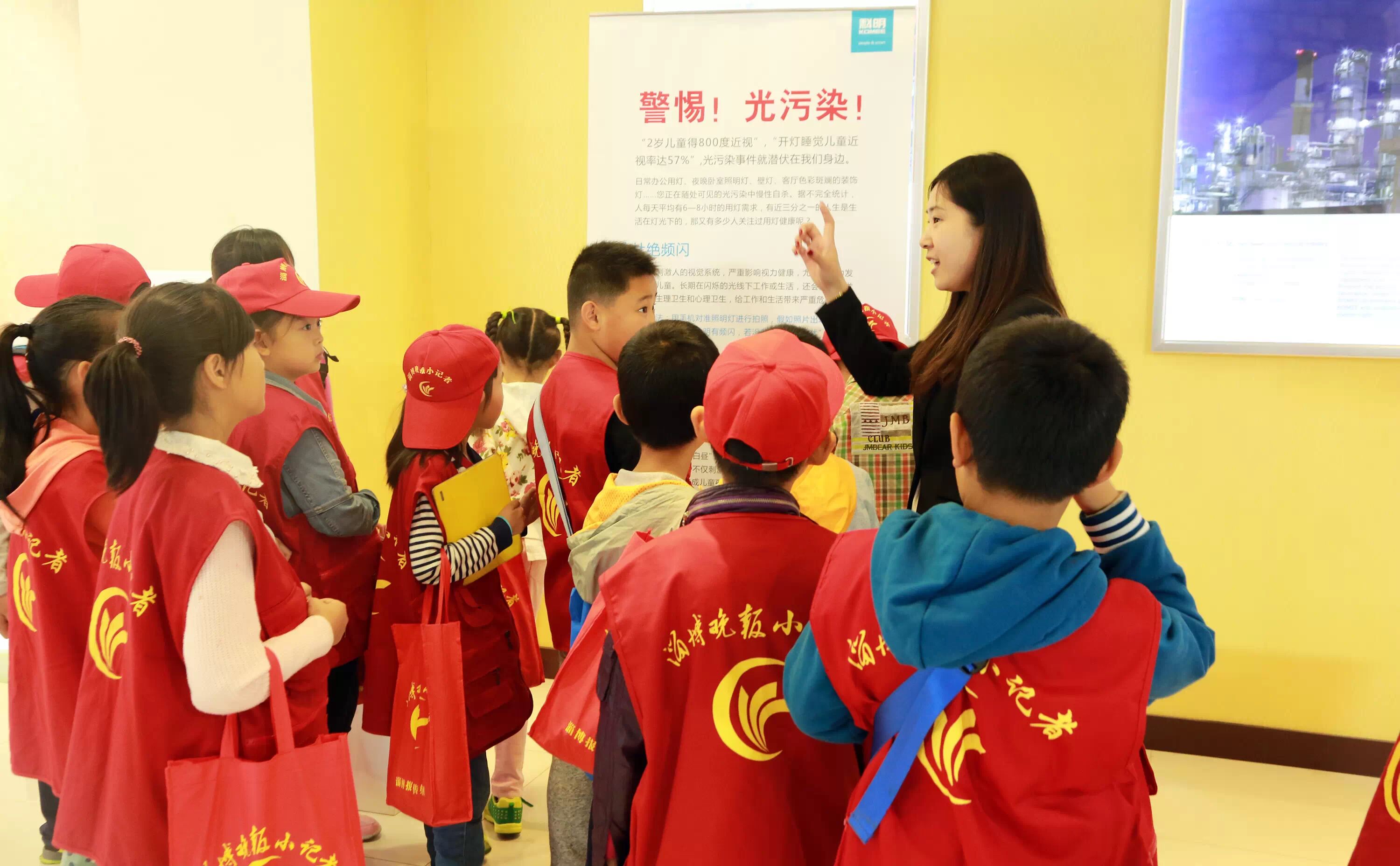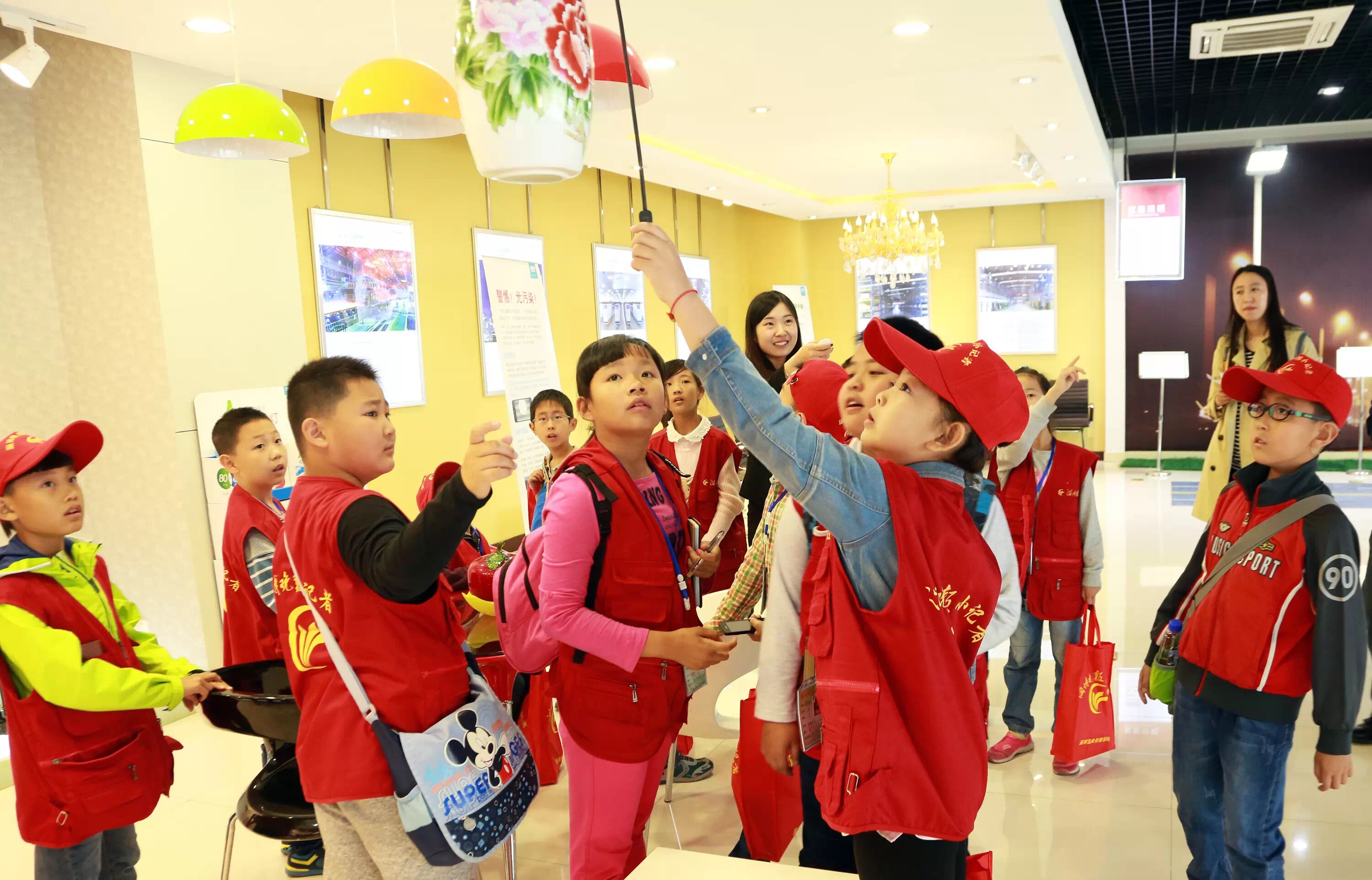 ▲警惕光污染!如何健康用光保护视力,LED灯比节能灯省多少电?讲解员生动形象的介绍,使小记者们意识到了环保健康用灯的重要性。健康用灯,从我做起。