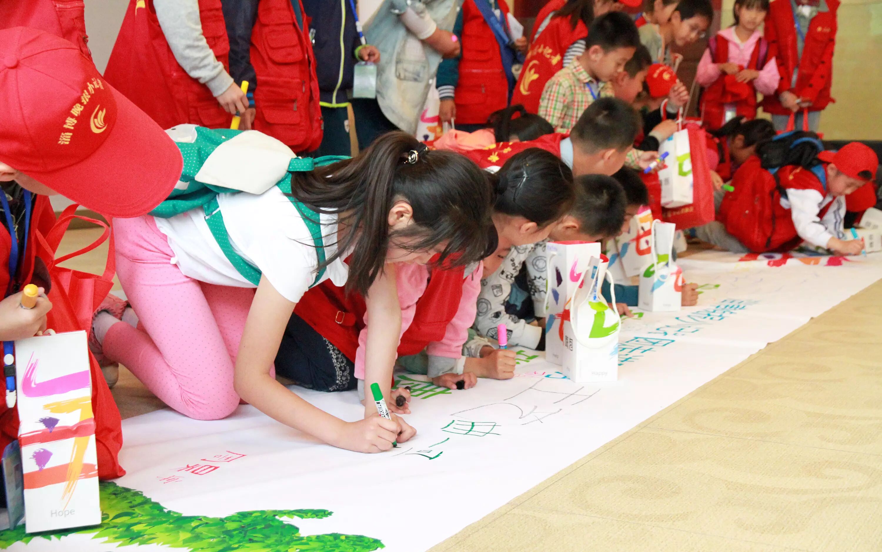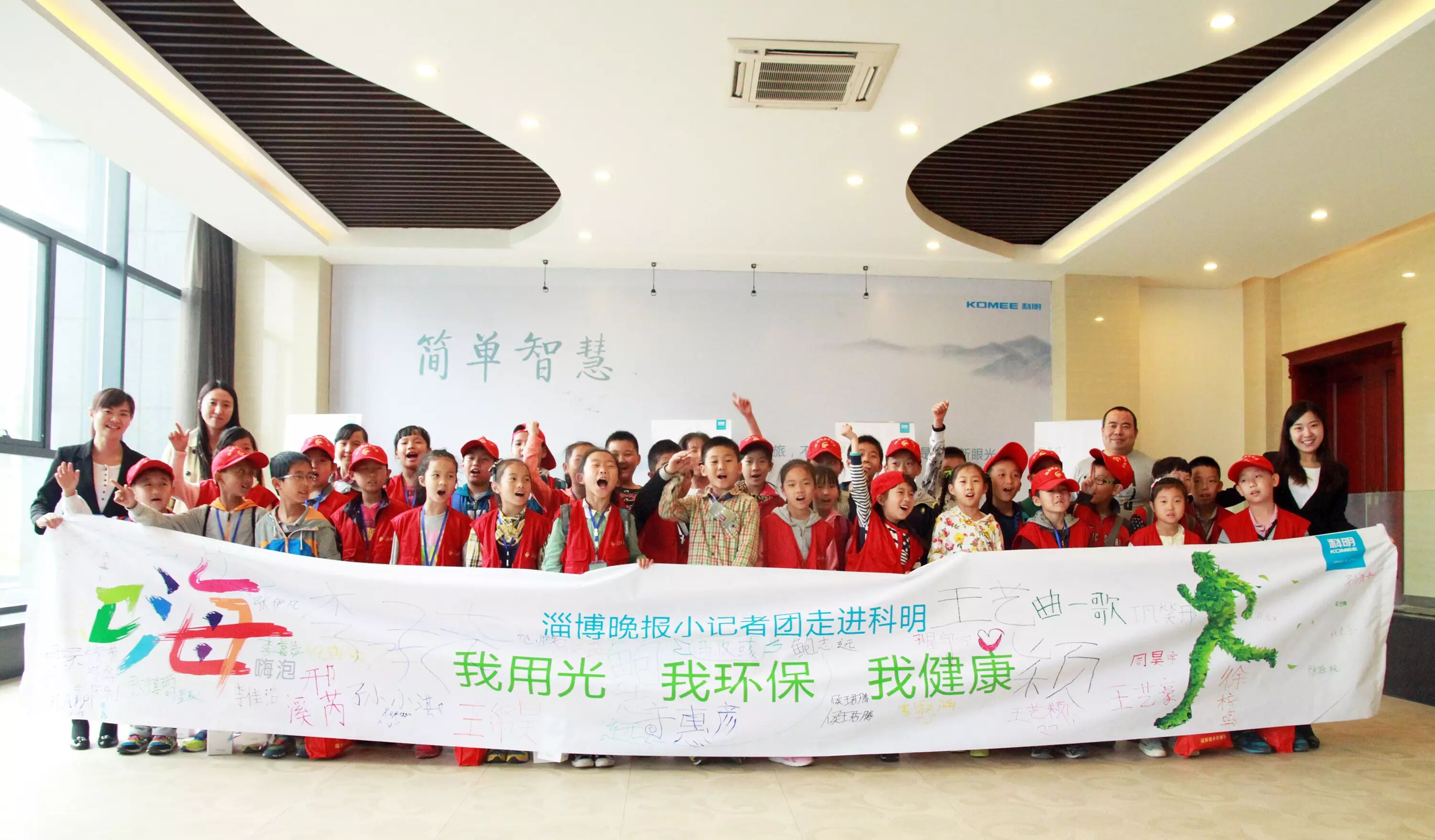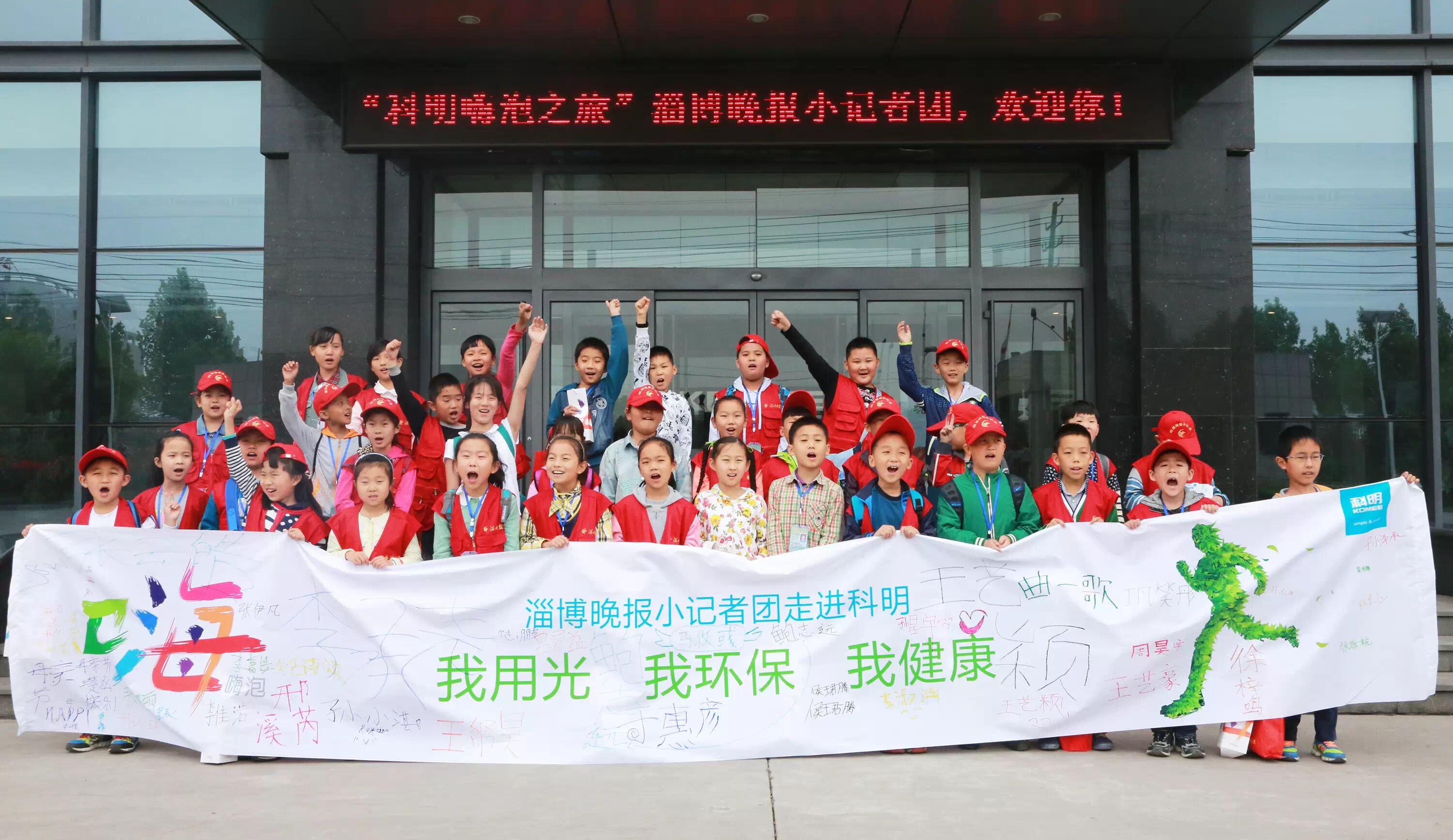 ▲“我用光,我环保,我健康”!小记者们在倡议活动的横幅上郑重的写下自己的名字,他们将用行动来支持嗨泡四季灯的健康环保行动。