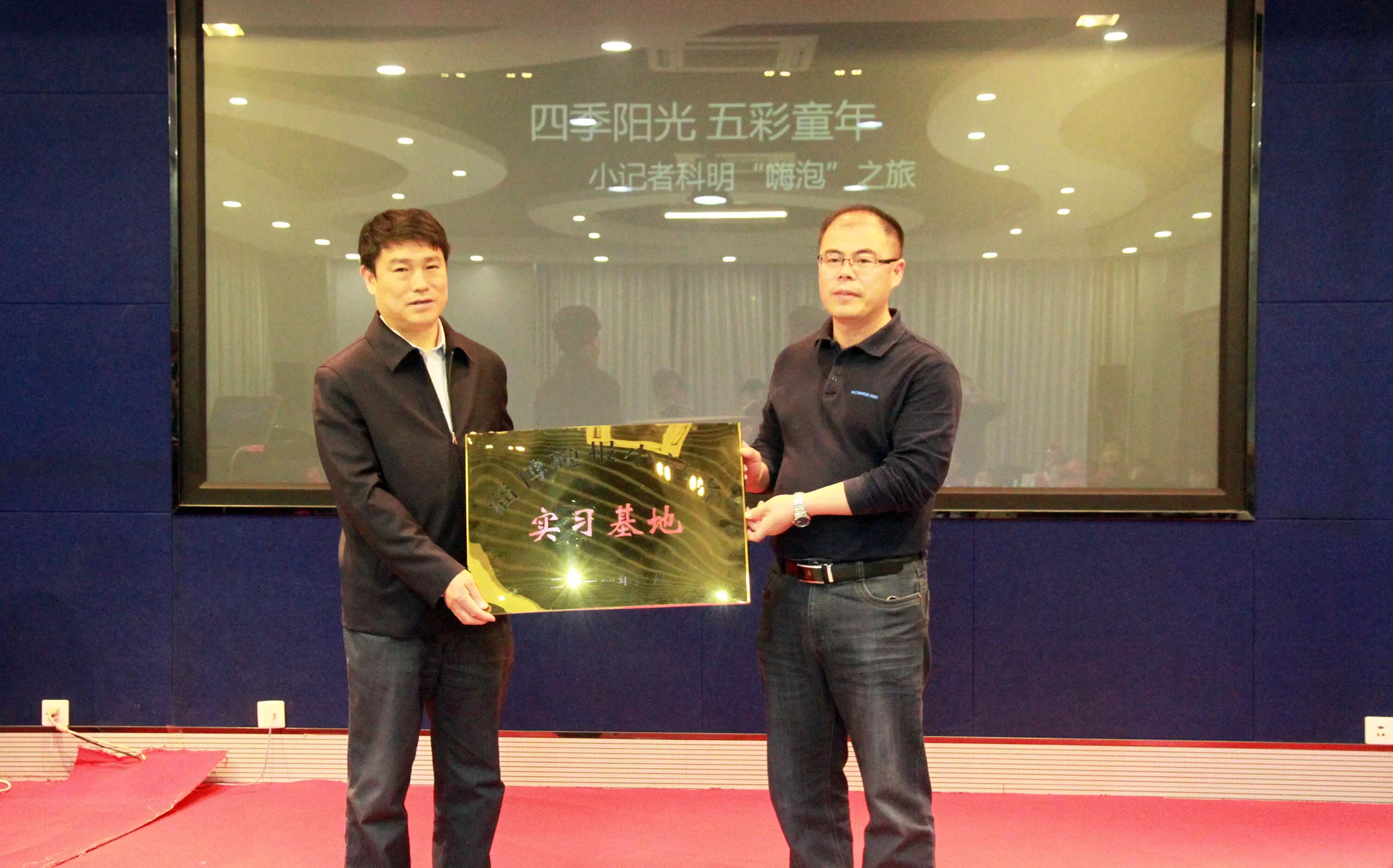 ▲授牌仪式。5月9日,淄博晚报小记者团科明实习基地正式成立。