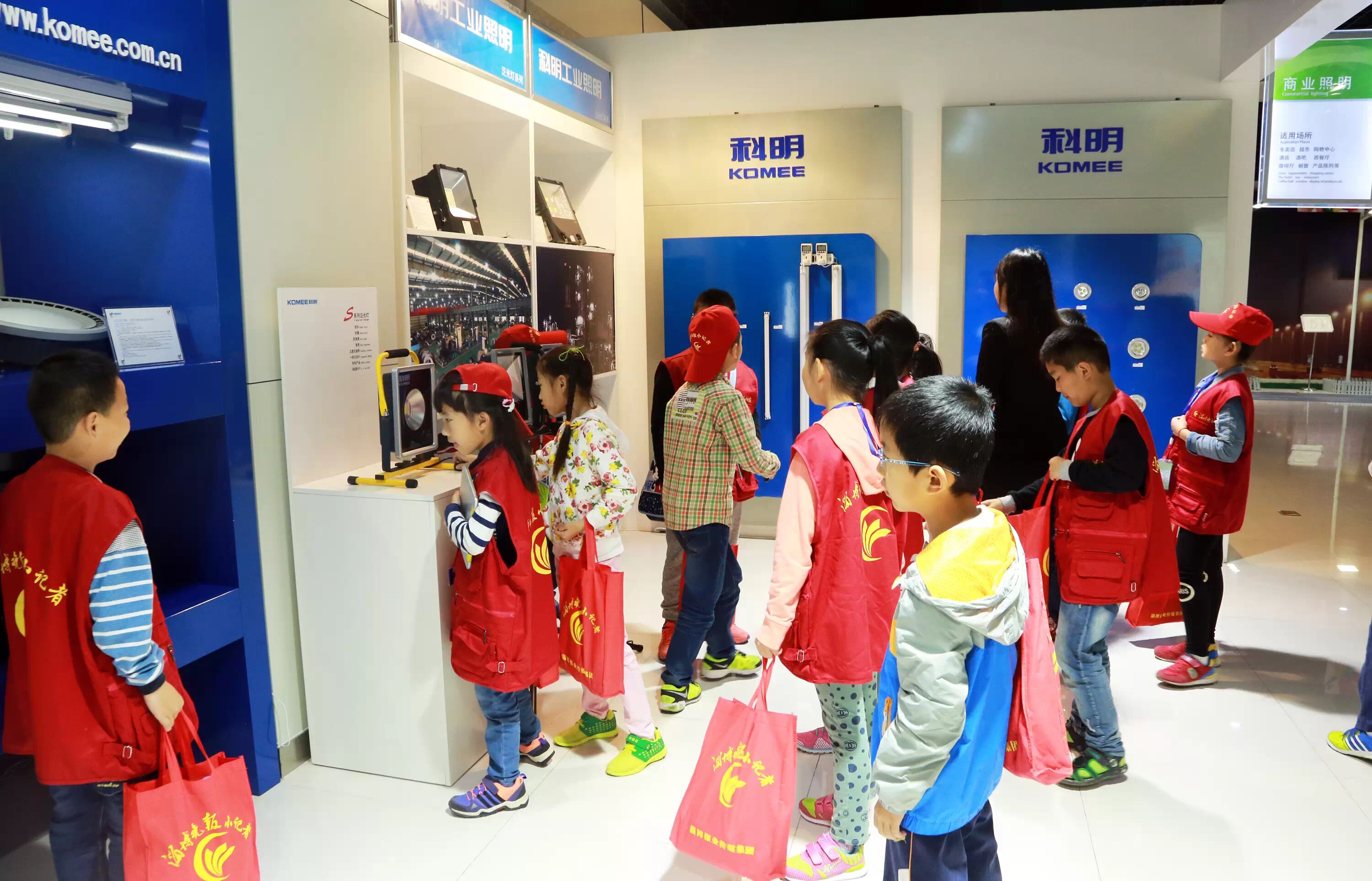▲科明工业照明展区,也吸引了小记者们的好奇心。